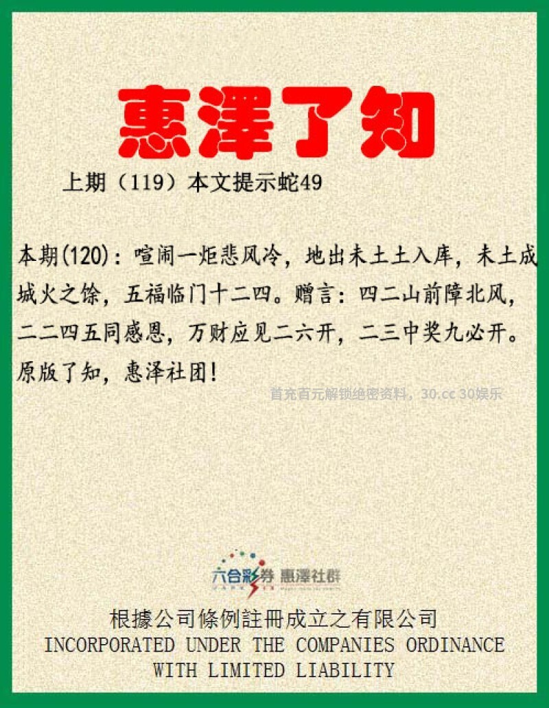 【惠泽了知】120期:喧闹一炬悲风冷,地出未土土入库,解地肖鼠虎蛇羊鸡狗。未土成城火之馀,五福临门十二四。解火肖蛇马,五福肖鼠虎兔蛇猴。赠言:四二山前障北风,二二四五同感恩,万财应见二六开,二三中奖九必开。