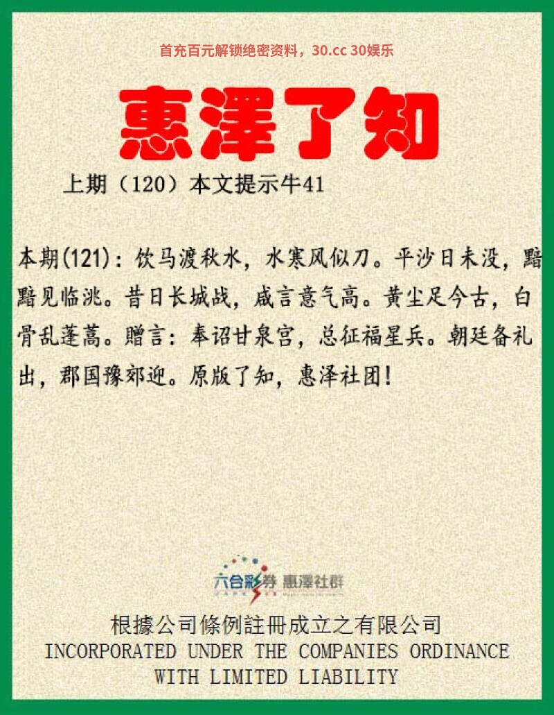 【惠泽了知】113期:小处不渗漏,暗处不欺隐,末路不怠荒,才是真正英雄。贈言:见贫休笑富休夸,谁是常贫久富家。诗文意思为:细微之处不可粗心大意疏忽遗漏,在没人见的地方不能做见不得人的事,即使处于穷途末路的时候也振作精神、奋发向上,这才是真正的英雄好汉。小处解小肖:鼠兔龙蛇猴鸡。暗处解阴肖:鼠龙马蛇狗猪。
